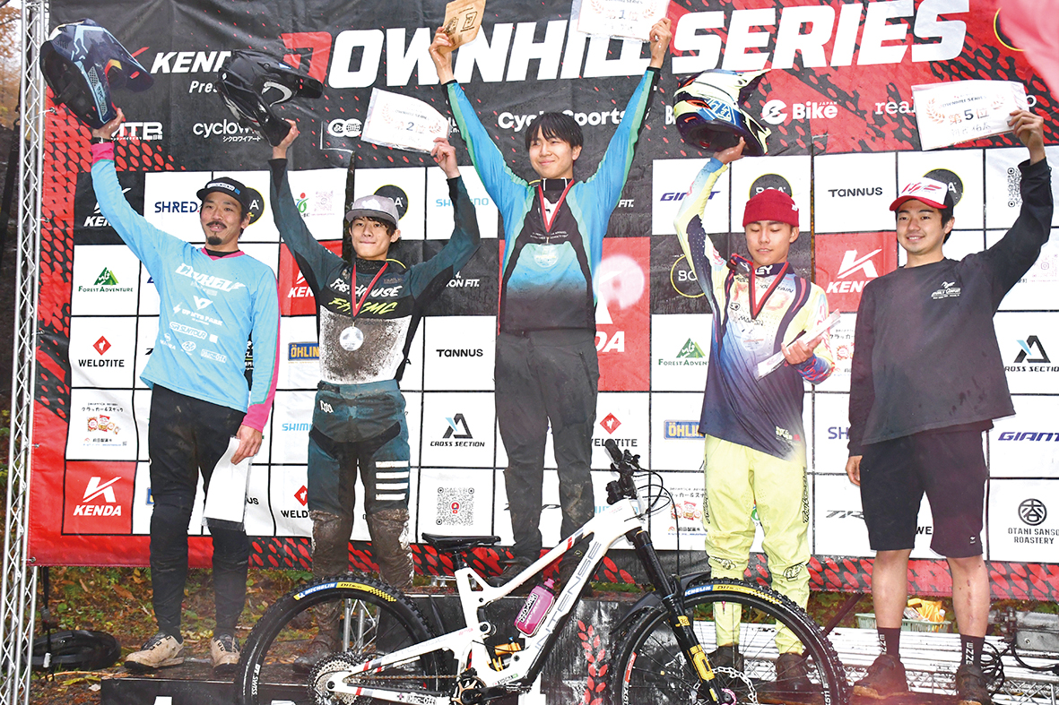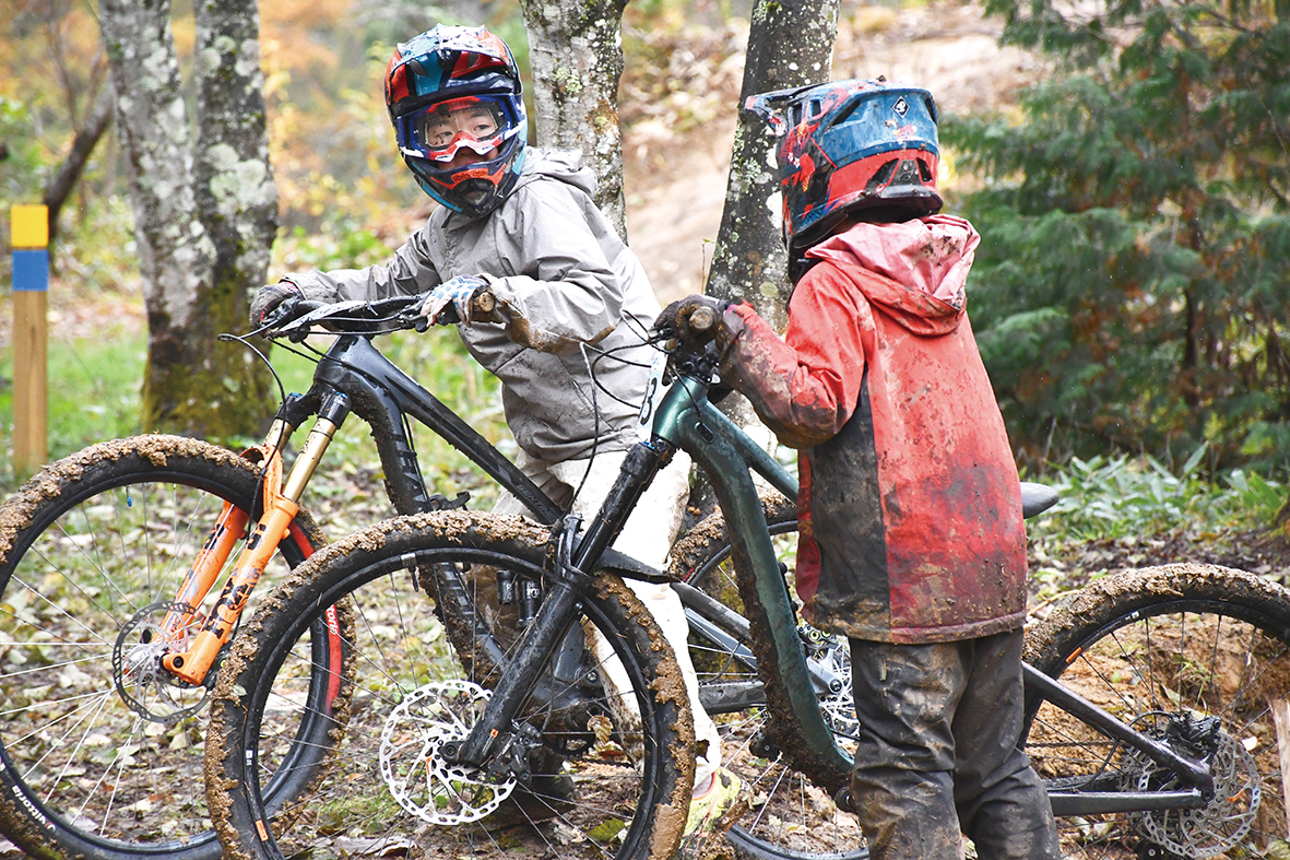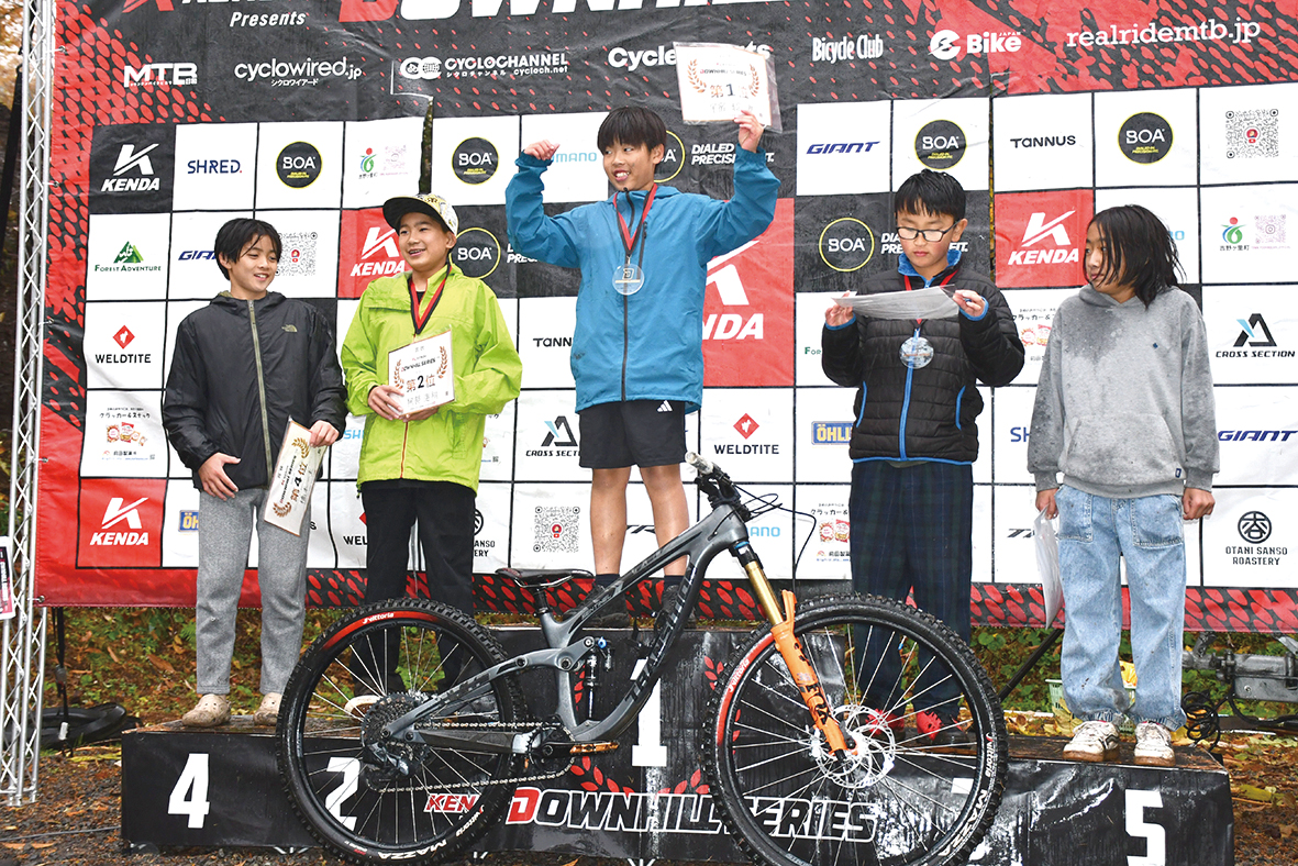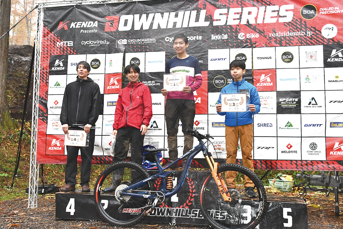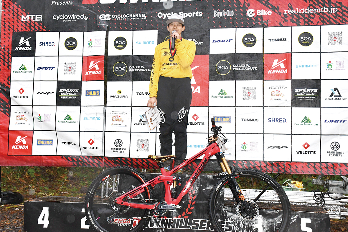 キッズクラスで優勝を果たしたのは、東京都から遠征してきた宇宿綜一郎くん。昨年から本格的にダウンヒルシリーズに参戦し、今回で通算6戦目という成長株だ。「下っている時がめちゃくちゃ気持ちいい。ガタガタしているのが楽しい」と語る一方、「最初は怖かったけど、練習して怖くなくなった」と素直な感想を述べた。地元ではなく、白馬や安曇野など各地に遠征してトレーニングを積む宇宿くん。レースで知り合った年上の選手たちと一緒に練習し、引っ張ってもらう環境が成長を支えている。試走中には自転車の部品が折れて棄権を余儀なくされる選手もいるほどのハードコースを、見事に制した宇宿くんの活躍は、世代を超えたダウンヒルシリーズのコミュニティの強さを物語っている。
