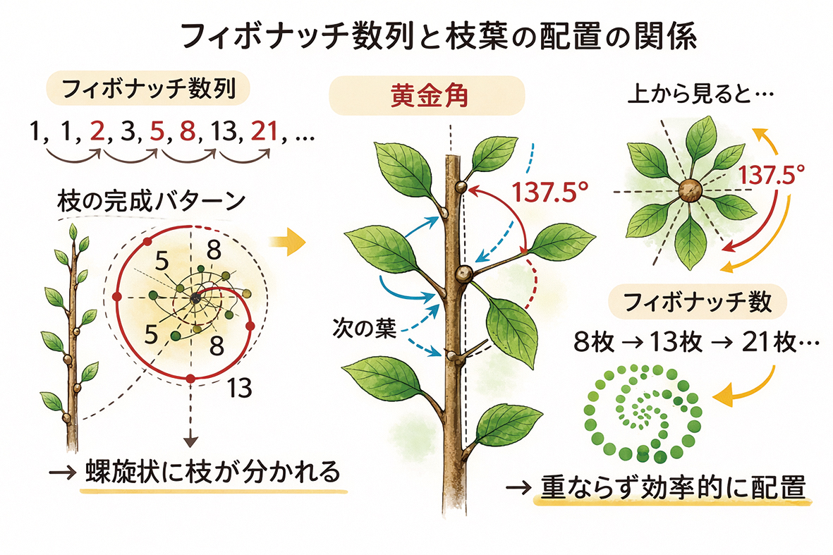 春になると、木々は一斉に葉を広げます。枝先に芽吹く若葉は一見ランダムに生えているように見えますが、実は一定の法則に従って並んでいます。葉や枝の配置をよく観察すると、一定の角度を保ちながら互いに重なりにくい構造をしていることがわかります。枝葉は約137.5度という角度で配置され、この角度は「黄金角」と呼ばれ、フィボナッチ数列とも深い関係があります。(図1)